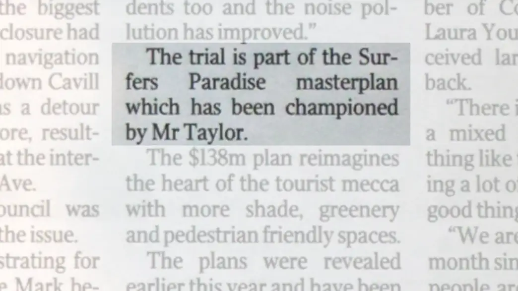 Darren Taylor Local Councilor for Division 10. According to the Gold Coast Bulletin article Darren Taylor is the champion of the masterplan and subsequent road closure.