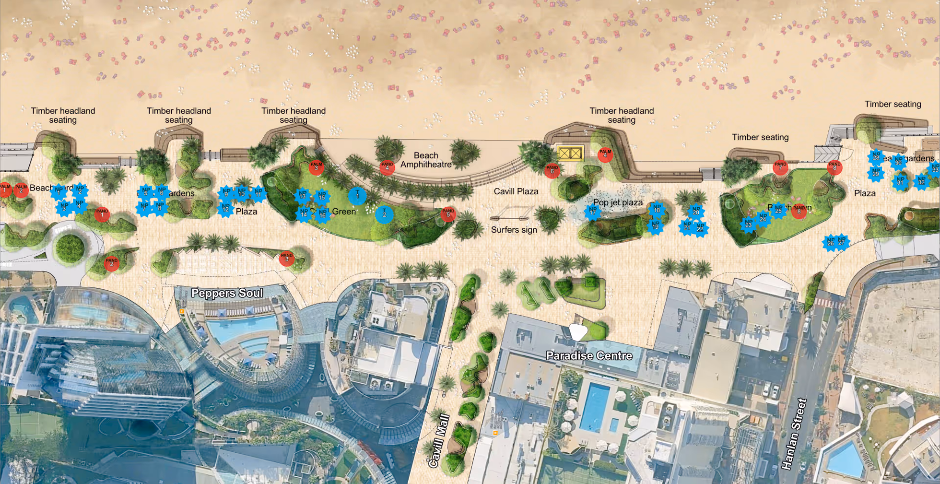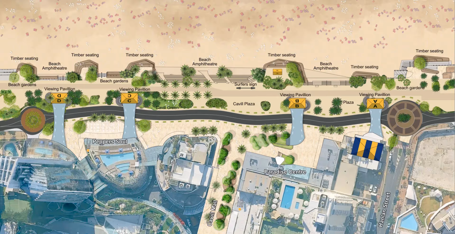 Iconic, Not Anywhere – pavilions, shelters and lighting must scream “Surfers Paradise,” not “suburban mall.”