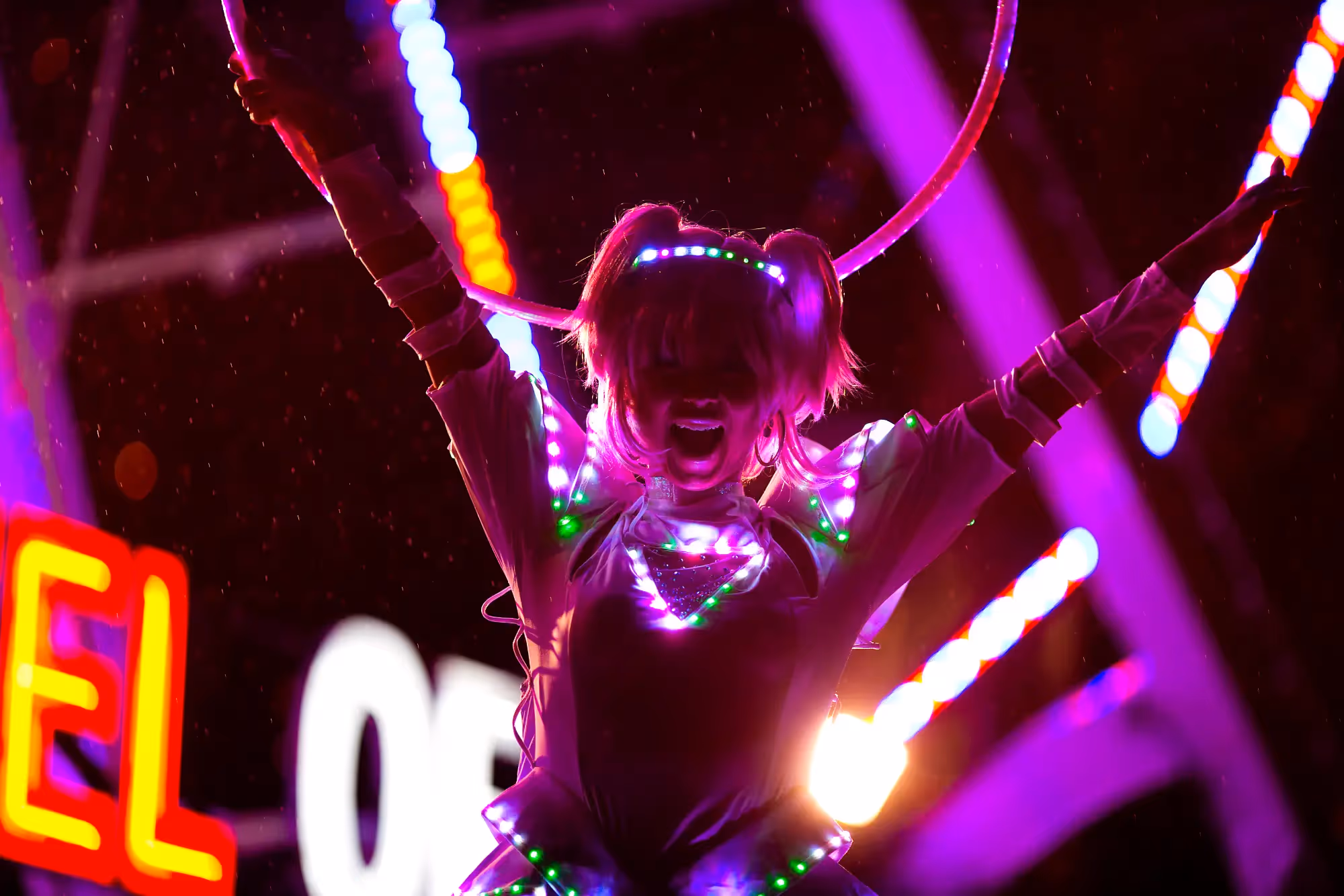 A stilt walker stole the show, dressed like an anime hero from the future, complete with a luminous cape, LED lights and a glowing hoop that added a magical edge to the evening. Despite a few showers, spirits were high. This is Surfers Paradise after all — a little rain never stops the fun.